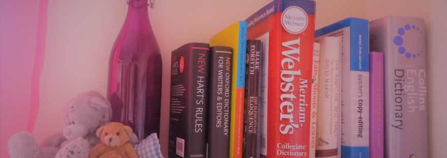 Behold my (not very big) reference shelf, currently awaiting the arrival of my copy of CMOS 17. Reference materials are vital for any editor. When I first started doing this, I, like many people, thought I knew loads about punctuation and grammar. Ha. Ha ha ha ha. Not a single working day goes by when I don’t have to look something up. This doesn’t mean I’m a terrible editor; it just means that there is an awful lot to know, the “right” style choice varies greatly depending on what you’re working on, and even if you think you know something, it never hurts to double-check.